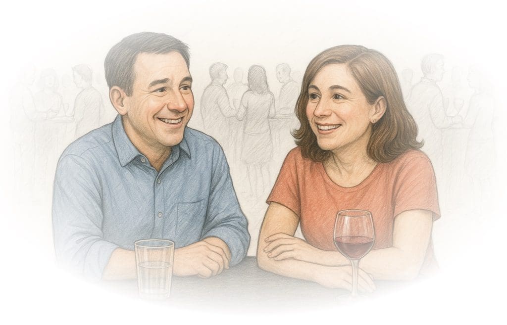 At the reception, she stood at one of the high tables, watching classmates laugh and catch up. But she felt somehow outside of it all, as if the person she had been back then didn’t quite fit anymore. That’s when, by surprise, a man walked up to the table and set down his glass. He looked around with the same sense of quiet distance. He looked, in some way, like he didn’t quite belong either. So she smiled and said,